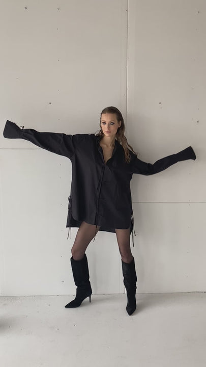Cotton blouse-dress is cut from 100% cotton and is decorated with our statement handmade ribbons. It has prolonged sleeves and that create a contemporary finishing touch. Despite the oversized fit the blouse-dress gently embraces the body creating a sensual look. Team the piece with heels and statement earrings for a night out or flat slides to create a holiday look. Perfect for layering over a bikini or wide trousers or jeans.